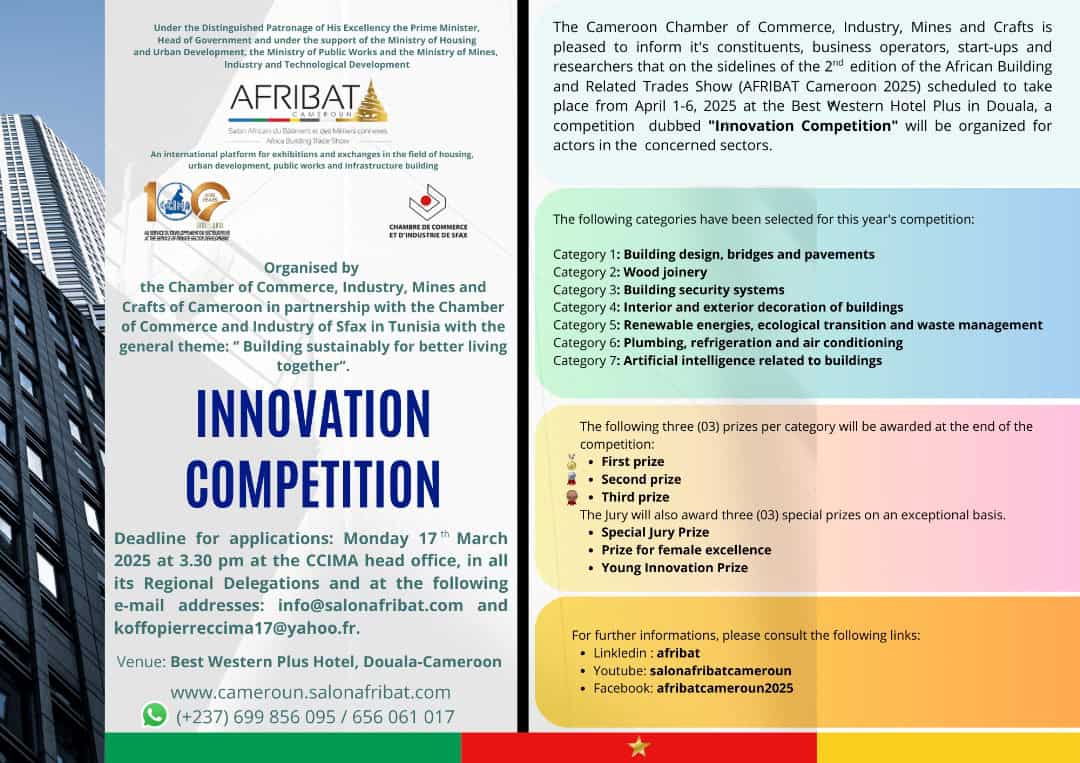 Participer à AFRIBAT Cameroun 2025 est une opportunité exceptionnelle pour les innovateurs de présenter leurs produits et services à un public international, de nouer des partenariats stratégiques et de renforcer leur visibilité dans le secteur du bâtiment et des métiers connexes. Cet appel à candidatures vise à attirer les meilleures innovations et à promouvoir des pratiques durables et innovantes dans le domaine.